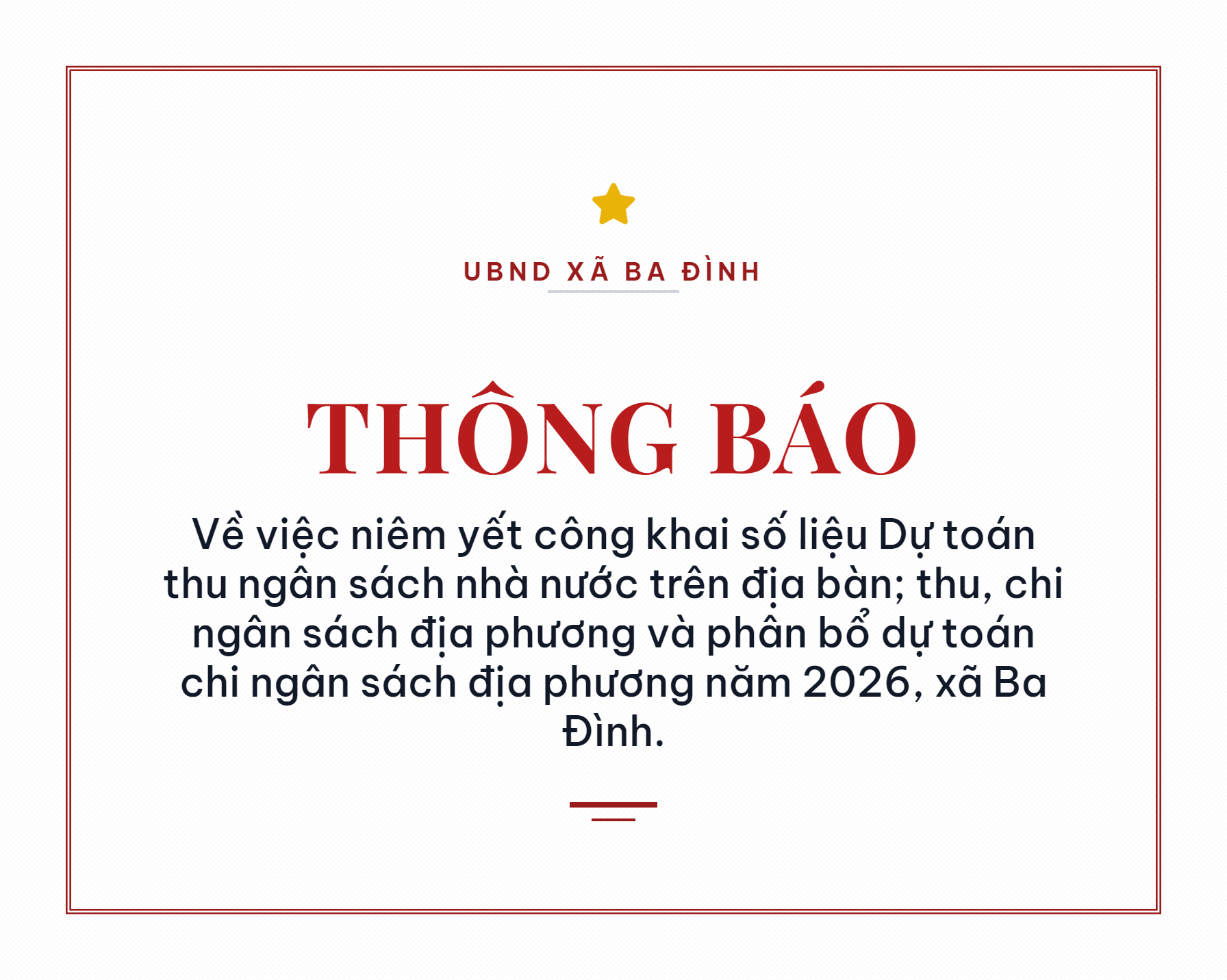 THÔNG BÁO Về việc niêm yết công khai công khai số liệu Dự toán thu ngân sách nhà nước trên địa bàn; thu, chi ngân sách địa phương và phân bổ dự toán chi ngân sách địa phương năm 2026, xã Ba Đình